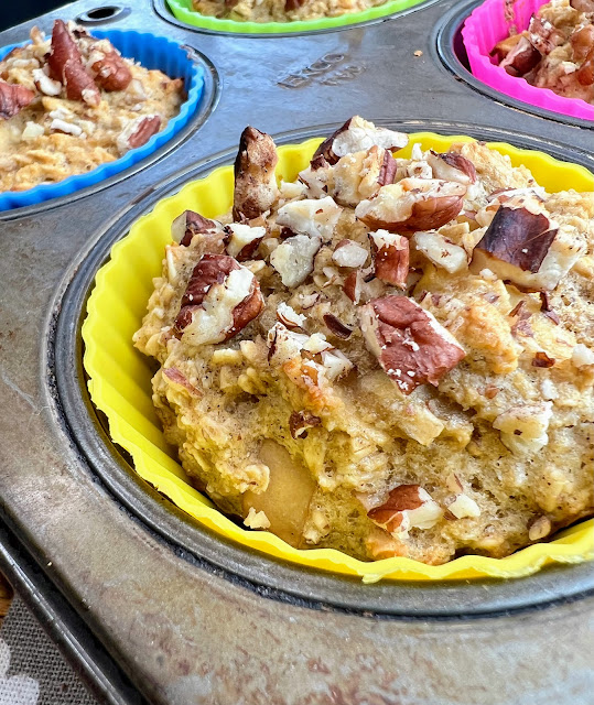 Add mashed Banana and Eggs to mixing bowl, beat til well incorporated, then beat in Applesauce, Almond Flour, Oats, Baking Powder, Cinnamon and Vanilla one at a time.  Stir in chopped Apple pieces, drop by 1/4 cup batter into 17 muffin tins, sprinkle with Pecans, bake at 350 for 25 minutes.  Enjoy 😊